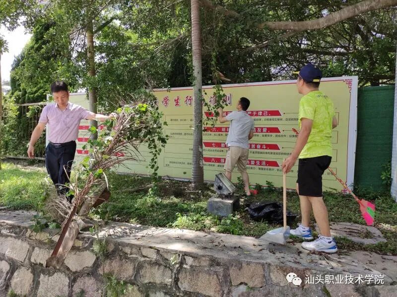 8月9日,根据《关于组织开展环境卫生整治义务劳动的通知》(汕职院创文办〔2020〕10号)要求,技能实训中心组织部门人员到院本部开展创文卫生整理活动,万松鑫主任亲自带领部门全体领导干部和党员等到技能实训中心所属责任区域进行卫生劳动,对学院侧门及周边环境区域绿化带、步道、第三实训楼周边环境等进行清洁,清除卫生死角、清理区域内的枯枝败叶、杂草树籽、纸屑和建筑废料等杂物,对墙上污渍和泥沙等进行清理。经过大家的共同努力,学院北门初步展现了干净整洁有序的环境面貌,营造了良好的校园入口环境,助力学院创文活动。