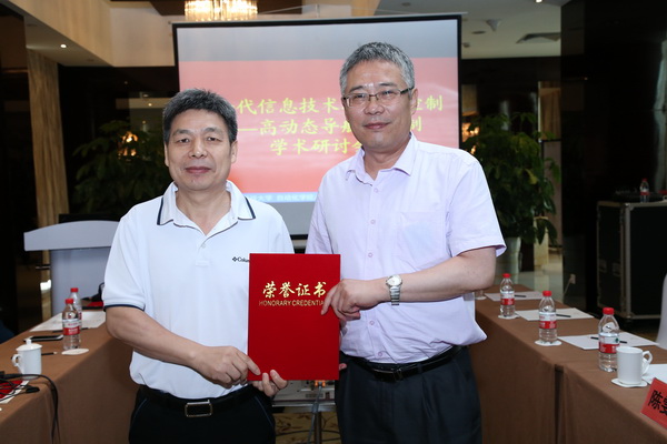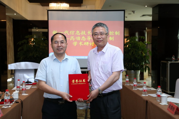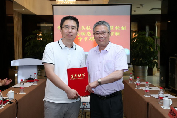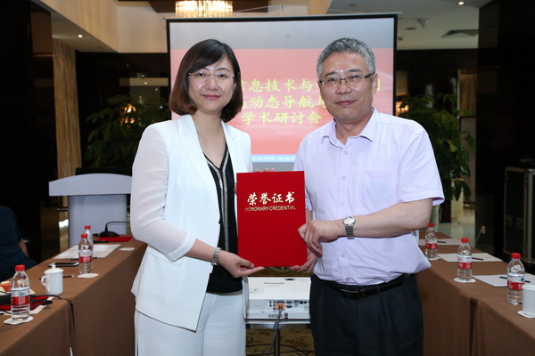 自动化学院院长和高动态导航技术北京市重点实验室主任苏中教授分别给北京理工大学自动化学院夏元清院长、北京工业大学自动化学院李晓理院长、国研城市运行研究院胡晓阳院长和北京航空航天大学宇航学院赵丹培副教授颁发主旨报告证书,感谢他们为实验室的发展所做的贡献。