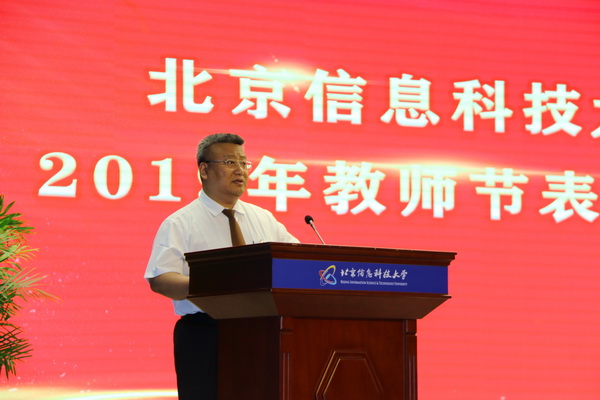 校党委书记王传亮出席大会并讲话。王传亮首先代表学校党委和领导班子,向辛勤耕耘、默默奉献在学校各条战线的全体教师,致以节日的问候,向受到表彰的先进集体和优秀教职工表示热烈的祝贺!王传亮表示,长期以来,学校广大教师以对党和人民教育事业的忠诚、高尚的理想追求、良好的师德修养和深厚的学识,坚守三尺讲台,克服各种困难,将满腔热情倾注在平凡的岗位上,助力学校发展建设取得了优秀的成绩。进入新时代,要实现学校三大历史性任务,过程必然充满艰辛,但要坚信学校的未来发展是大有希望的、前景光明的。王传亮强调,一是要把握发展时机,维护良好态势。学校作为国家队出身、北京市重点支持建设的信息学科较为齐全的高校,学科专业布局与时代发展、国家和北京市战略需求十分契合。近些年来,学校发展呈现良好态势,要倍加珍惜,使之成为大势所趋,势在必得。二是要提升综合实力,塑造整体形象。要坚持目标导向、服务导向、问题导向,聚焦内涵、特色、差异化发展,写好教育“奋进之笔”,持续提升综合实力和核心竞争力,更加注重塑造学校的整体形象。需要广大师生员工参与,利用各种资源,借助新校区建设、聚焦核心竞争力等多种途径,加大宣传力度,形成人人想方设法、个个做出贡献的局面,让信息科大在社会各界当中产生良好的社会反响。三是要奋进新时代,争做好老师。学校的超常规、跨越式发展关键在人才,在广大的教职员工。学校党委将把教师队伍建设作为基础性工作,进一步推进涉及学校发展全局和教职工切身利益的重大问题的解决,进一步增进对教职工情感沟通、人文关怀,让广大教职工工作生活有希望、有奔头,更好地释放创造力。广大教职工要切实做到以德立身、以才立业、以文化人。王传亮希望,全体教职工坚持立德树人,弘扬高尚师德,以强烈的使命感和事业心,积极投身学校的改革发展,努力建设北京信息科技大学更加美好的明天!