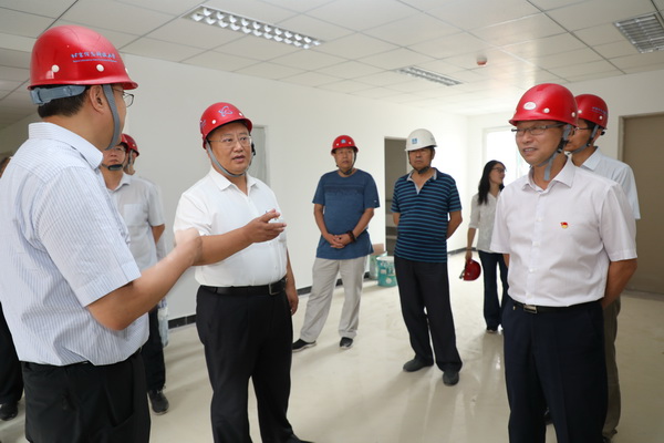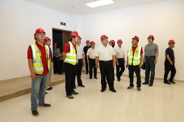 王传亮一行首先来到第一教学组团施工现场,进入正在施工的基础教学楼,参观了教室装饰装修样板间。王传亮详细询问了教室内部各项设施的基本情况,敦促要尽快做好教室讲台及课桌椅等设施的相关规划设计。王传亮随后来到学生宿舍B组团,查看了学生宿舍标准间、洗浴间、盥洗室等装修设计情况,强调要严格按照相关要求施工,确保施工质量。