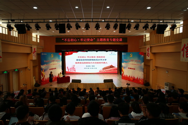 10月23日下午,校党委副书记、校长王永生在小营校区大学生文化艺术中心,讲授题为“不忘初心,牢记使命,勇担责任,建设信息特色鲜明的高水平大学,培养担当民族复兴大任的时代新人”“不忘初心、牢记使命”主题教育专题党课。北京市委第十三巡回指导组谭永旭副组长、徐甲、高立群应邀到场指导。部分校领导、处级干部和教工党员,民主党派和无党派人士代表,学生干部代表共计320余人聆听党课。党课由校党委副书记王秀彦主持。