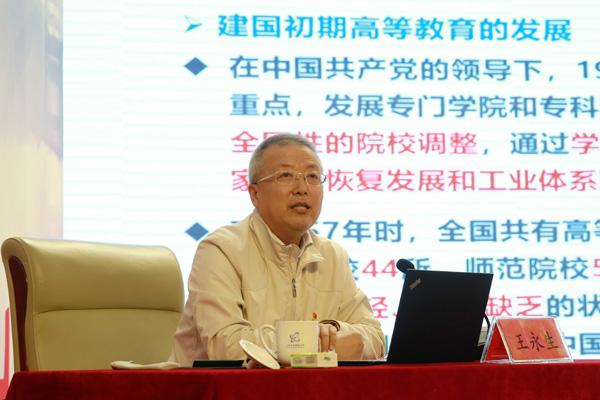 王永生回顾了共和国高等教育的发展历程,强调新时期办好高等教育必须坚持党对教育事业的全面领导,坚持社会主义办学方向,坚持以政治建设为统领;必须坚持以人民为中心的教育思想,坚持教育的“四个服务”面向,扎根中国大地办好教育,办好人民满意大学;必须坚持把立德树人作为根本任务,围绕立德树人建设全面培养的教育体系,发展厚重本科教育,重塑教育教学形态,建设高素质教师队伍,培养堪当民族复兴大任的时代新人;王永生从历史方位、社会发展阶段、教育的环境格局和教育对象等方面分析了加快推进教育现代化的重要性和紧迫性,强调必须坚持加快推进教育现代化、服务于中华民族的伟大复兴。