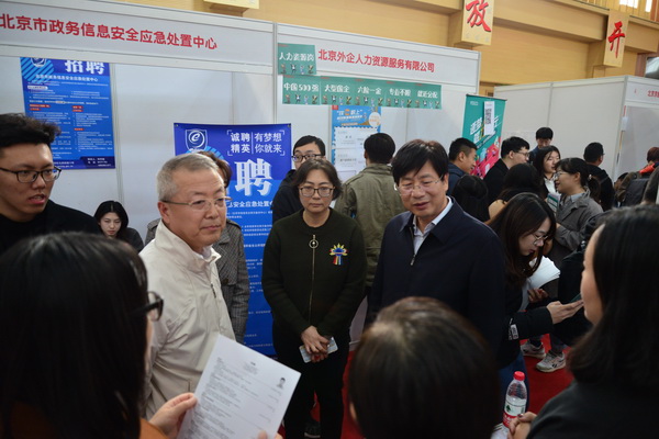 10月25日下午,开元集团网站与北京市教委高校毕业生就业指导中心联合举办的2020届毕业生秋季第二场校园招聘会在小营校区大学生文化艺术中心举办。校党委书记王传亮,校党委副书记、校长王永生,副校长陈刚到招聘会现场了解学生应聘及就业情况。