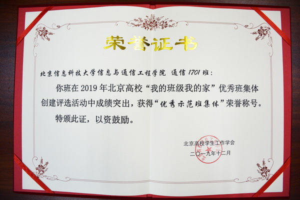 开元集团网站信息与通信工程学院通信1701班荣获2019年北京市“优秀示范班集体”