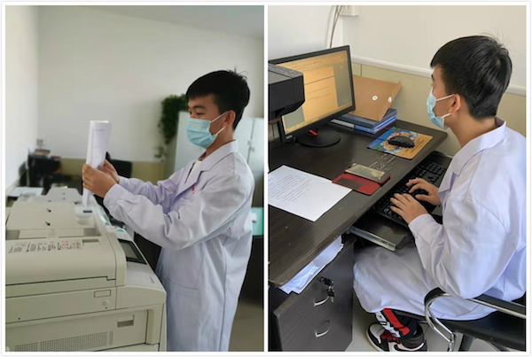作为医务人员的家属,蔡子博支持母亲工作的同时,帮助做好医院的文档编排,服务家乡防疫工作。蔡子博的母亲是一名医务工作者,疫情爆发后,母亲从大年初一开始就奔走在前线,每天到深夜才能回家。一方面为了支持母亲的工作,更重要的一方面,想要为全国的抗击疫情尽自己一份力,蔡子博决定去母亲所在的医院做一些力所能及的事情。他在做好自我保护的前提下,在母亲所在医院的文印室,承担了制作表格、文档的工作。在他协助编辑打印新型冠状病毒肺炎诊疗方案的工作中,从第一版到第四版,方案一步步优化,他一丝不苟地完成任务。并将在此过程中学到的抗疫医疗知识向身边人进行普及。