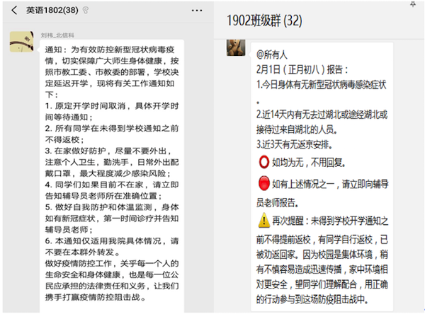 学院成立了“外国语学院SARI病毒防控工作小组”;设立专项党费用于新型冠状病毒感染肺炎的疫情防治工作;发挥班主任和班委的作用,及时联络同学,确保消息通知到位到人;在微信群、朋友圈发布疫情防控注意事项和防控措施,提醒学院同学做好预防和防护;掌握学院留校学生的人数和情况,并每日报送;实行日报制度,要求本院同学每日报告身体状况及相关情况;填写《每日信息报送表》,上报学生处;开展《进、返京情况摸排表》,掌握进、返京人员的出行动态、身体状况及相关信息;及时发布学校延期开学通知,结合学校、勤信学工公众号消息,以朋友圈、微信群、私信、电话等方式进行发布,确保通知到每一位同学,对计划提前返校学生进行引导、劝说;年级辅导员、班主任联系境外交流同学,叮嘱其做好防护工作;就业辅导员联系就业实习同学,叮嘱其尽量在家,推迟实习、做好防护。