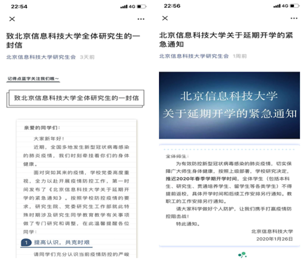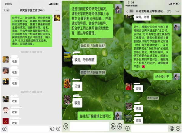 发出《致全体硕士生导师一封信》,对导师作为研究生培养“第一责任人”提出明确希望和要求,确保严格落实疫情防控工作要求,提醒任课教师及导师做好延期开学的各项准备。通过研究生会公众号发出《致全体硕士研究生一封信》,要求研究生不离家不返校,加强与导师联系,提醒研究生减少出行,做好防护;加强联系,及时报告;主动学习,自我提升;遇到问题,寻求帮助,共同打赢疫情防控阻击战。