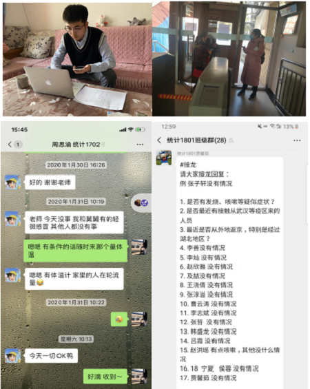 学院布控多条线索确保学生群体防控工作有效开展。学院成立学生工作组专门负责学生层面的防控工作。面对学生人数更多、情况更复杂的前提下,辅导员、班主任、研究生导师齐上阵,发挥学生干部和党员的桥梁纽带作用,搭建四位一体的信息沟通平台,确保“联系不掉线、问题不拖延”。将网络信息互动作为主渠道,通过建立微信群、音频视频沟通、QQ互动、微博和抖音平台关注等形式开展工作。大年初一,辅导员马川茼重感冒说不出话仍坚守“看不见”的线上岗位,逐一与学生了解去向、身体状况;研究生导师和班主任坚持每日了解学生情况并在工作群打卡上报。