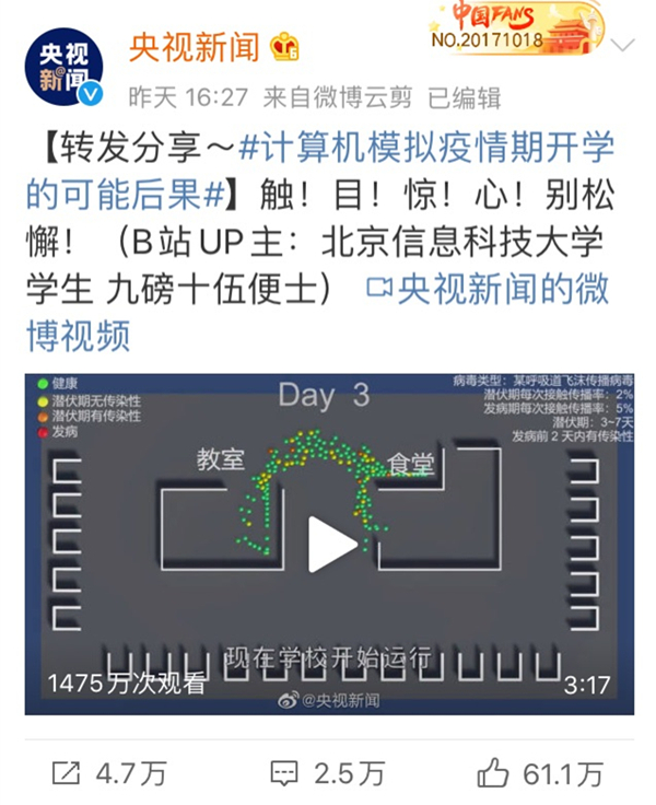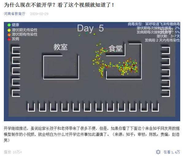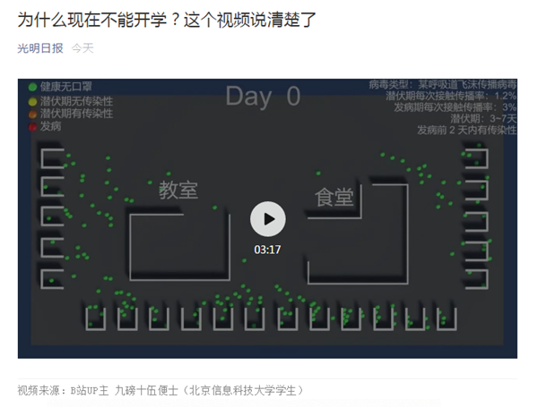 视频模拟了一个由教室、食堂、学生公寓组成的简单的学校场景,其中,不同颜色动态点代表不同情况的学生,模拟了在全体同学不戴口罩、戴口罩但是发病不隔离、发病后隔离等各种情况,最终得出结论,即便是大家都认为最安全的全体同学戴口罩且发病同学被隔离的这种情况,也可能会导致较大范围的感染,从而科学、形象地向大家解释学校为什么还不能开学。