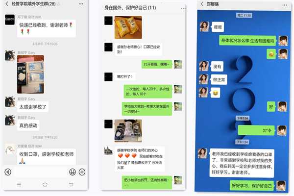 身在境外的同学们对于学校的关怀非常感动,纷纷发来信息,感谢学校不远万里寄来的“暖心礼物”。信管学院周涵同学在收到学校邮寄的防疫物资后,动情的说到:“最近国外疫情肆虐,网络上针对留学生的留言铺天盖地,这一切让周围的环境变得十分压抑。突然收到学校跨洋过海邮寄过来的防疫包裹,心中非常的温暖,虽然远在他乡,但祖国和学校从来没有忘记过我们,被牵挂着的感觉真好,真的非常感谢学校和各位领导老师的关心,我们一定会好好的,不辜负国家和学校对我们的期望。
