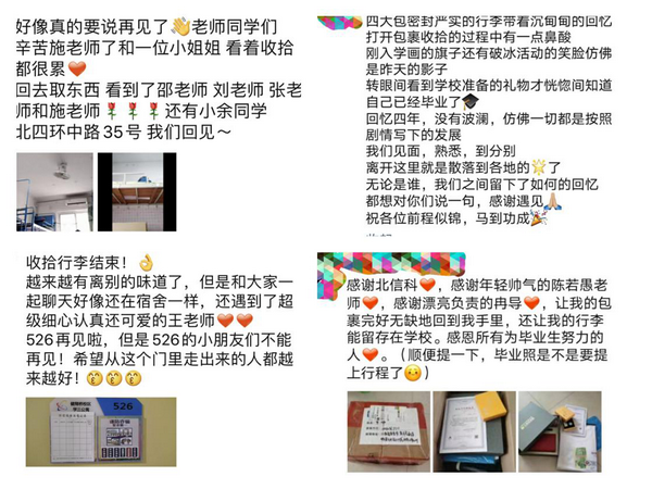在毕业“寄“工作中,每一位老师都全身心投入。学生们看着爬高下低、汗流浃背的老师亲手为自己打包行李,不禁深受感动,纷纷留言表达感谢,在朋友圈晒图,为这个特殊毕业季增添了浓墨重彩的一笔。