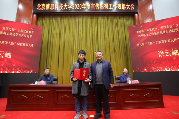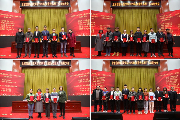 周志成宣读《中共北京信息科技大学委员会关于表彰2020年度宣传思想工作先进单位和先进个人的决定》。大会对教育部“共抗疫情、爱国力行”主题宣传教育和网络文化成果征集展示活动优秀奖、第九届“首都十大教育新闻人物”学校推荐人选、学校阻击新冠肺炎疫情主题作品征集活动、2019年北京高校“双百行动计划”市级优秀项目、2020年北京高校“双百行动计划”校级优秀项目、2020年度新闻宣传先进单位和个人、北京高校师生脱贫攻坚主题社会实践调研校级优秀成果、“使命在肩 奋斗有我”系列主题作品征集活动校级优秀项目、2021年度高校思想政治工作培育建设项目校级优秀项目、2020年基层立项课题校级优秀课题、2020年度北京高校思想政治工作研究课题校级优秀课题、2020年度“学习强国”先进单位、“爱国心、报国情、强国志”强国征文等获奖单位、团队和个人进行了表彰。