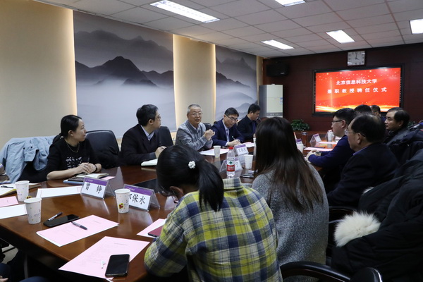 双方签署聘任工作协议,王永生宣读聘任朱强教授为北京信息科技大学兼职教授的决定并颁发证书、佩戴校徽。