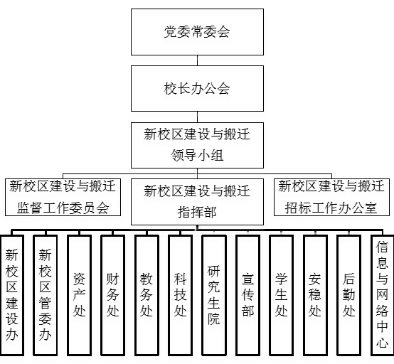 近日,北京信息科技大学党委书记王传亮主持召开党委常委会,专题研究新校区建设与搬迁工作,会议决定,调整设立新校区建设与搬迁相关组织机构(如图),统筹指挥和推进新校区建设与搬迁工作。