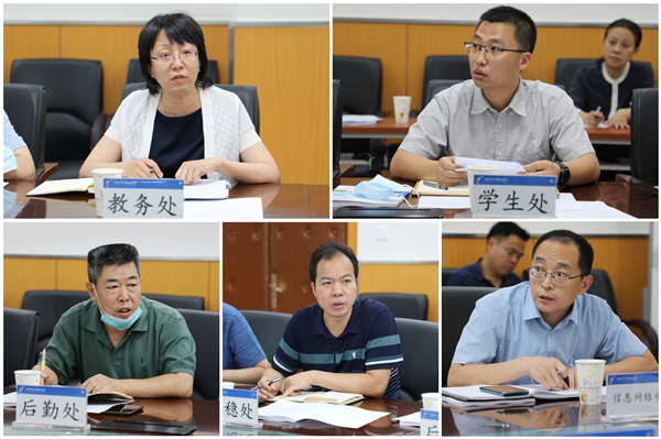 新校区建设办主任崔凯汇报新校区建设工作进展情况;新校区管委办常务副主任赵立胜汇报新校区搬迁工作进展情况;资产处处长胡滔、财务处处长张莉、党办主任王智勇、宣传部部长杜世智、教务处处长米洁、学生处处长张景波、后勤处处长郑召义、安稳处处长龚汉明、信息网络中心副主任(主持工作)王明涛,针对新校区管委办函询内容,分别就各自负责工作进行了汇报。