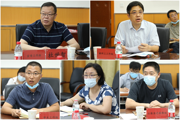 会上,学校疫情防控领导小组办公室和八大工作组分别就所在小组疫情防控工作开展情况及存在问题进行汇报。人事处处长谢新伟代表教师工作组汇报了教职工流调台账工作、进出京管理审批等工作开展情况;学工部部长张景波、研工部部长王兴芬代表学生工作组分别就各地本科生、研究生信息报送台账工作、在校生管理、学生思想工作等方面进行汇报;后勤党总支书记刘伟代表后勤医疗组汇报了疫情期间后勤工作的开展和后勤物资的保障情况,校医院院长才秀芬汇报了校医院应急处理机制、核酸检测、隔离区的设置及暑期就医等医疗保障工作开展情况;安稳处处长龚汉明代表安全稳定工作组就疫情期间严控人员、车辆出入流程,安保人员管理和设置,校园安全保障等方面进行汇报;教务处处长米洁、研究生院常务副院长王兴芬代表教学科研工作组汇报了当前科研工作开展情况、疫情期间实验室进出管理和线上线下教学工作两手准备的预案制定情况;宣传部部长杜世智代表宣传工作组汇报了疫情变化以来学校新闻网、疫情防控专题网站、学校官微在教育引导、宣传报道等方面工作以及舆情相关情况;党委办公室主任王智勇代表领导小组办公室就各小组协同配合、师生大数据排查等工作进行汇报;校长办公室主任贾斌代表信息报送组汇报了信息报送、各个校区连同家属院社区联防联控等工作;纪委办公室主任英树志代表纪检监察工作组对疫情防控工作检查中发现的问题和缺漏进行汇报。