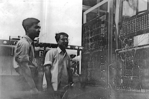 (图1 第一届计算机训练班时,周锡令(左)与同组学员安建勋(右),他们完成了一个电子管的四位运算器实验装置(照片右侧))