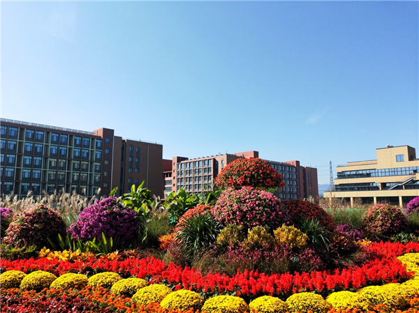校园内花团锦簇,“建最好的大学,做最好的自己”掩映在花海之中,浓浓的喜意晕染整个校园,让我们在最美好的时代,一起努力建设最好的大学,力争做最好的自己。