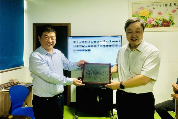 方德英向校友们赠送了印有学校小营校区主教学楼的纪念雕刻,并邀请校友们在明年的85周年校庆之际回到母校,到学校新校区再叙情谊。