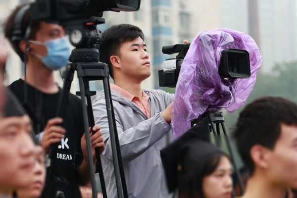 苗剑飞入职后,主要负责校园宣传阵地管理、学校重大活动的氛围营造、新闻摄影摄像和视频媒体平台运营等工作。他感觉到自身技术水平不够,于是自学新闻摄影、图片精修、视频制作等技能。新校区建设还在紧锣密鼓地进行中,苗剑飞也像敏锐的猎人一样捕捉着新校区所有值得记录的画面和时刻。他在拍摄中总是对构图、感光度、快门等参数反复调试,有时候为了拍到好照片,苗剑飞能摆出各种“难掌握”的姿势。他拿着沉重的机器能上能下、能跑能跳、能举能趴,成了大家眼中的“孙悟空”。对于成品,苗剑飞总是不惜花时间精挑细选,在需要的时候,还对作品进行精修,力使照片既符合规范,又具有一定的审美价值。在短视频盛行的今天,苗剑飞洞察到它对于增强学校宣传工作效果的重要作用,主动向部门申请开通视频号、抖音、快手、哔哩哔哩等视频新媒体平台账号,并负责维护和运营,这也成了多方位、全视角记录、展现新校区建设实况的重要方式。有些拍摄任务要求全程跟踪。这往往需要前期策划、现场踩点,中期实时跟拍、记录,后期编辑成图文影像。苗剑飞说:“一张张相片、一个个视频,记录着新校区的阶段性成果和变化,我觉得自己是历史的见证者,十分荣幸,这也是我做好宣传工作的初心和动力。”