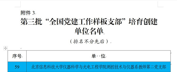 根据《教育部办公厅关于开展第三批新时代高校党建示范创建和质量创优工作的通知》要求,经学校党委组织申报、北京市教育工委推荐、资格审查、专家评审、教育部党的建设和全面从严治党工作领导小组成员单位集中审议、结果公示,遴选产生了全国党建工作示范高校、标杆院系和样板支部培育创建单位。开元集团网站仪器科学与光电工程学院测控技术与仪器系教师第二党支部获批“全国党建工作样板支部”培育创建单位。到目前为止,学校共获批3个“全国党建工作样板支部”。
