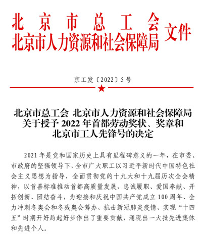 日前,北京市总工会、北京市人力资源和社会保障局公布《关于授予2022年首都劳动奖状、奖章和北京市工人先锋号的决定》,学校被授予2022年“首都劳动奖状”荣誉称号。