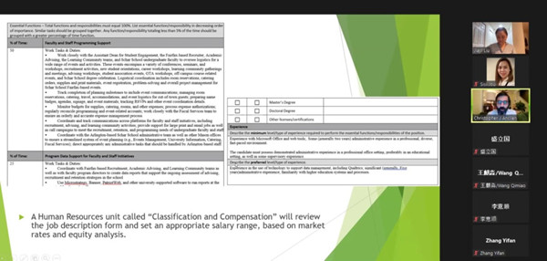 5月30日至6月13日,国际交流合作处与人事处共同举办的处以下管理干部因公出国(境)培训在线上开班。本次培训邀请到乔治梅森大学沙尔政府与政策学院院长 Dr. Mark Rozell、高等教育系主任 Prof.Daniel Chen、教育学院Prof.April Mattix Foster、人力资源和人才管理主任Mr.Chris Anclien等7名乔治梅森大学的专家学者主讲。来自学校7所学院17个部门共计40余名干部参加了本次培训。