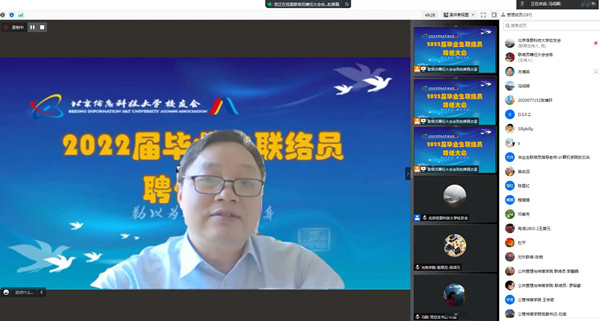 林国策宣读了《给校友联络员指导老师的一封信》,表达了对联络员指导老师的感谢,邀请老师与学校一起搭建联络的平台,让校友和校友之间、校友和恩师之间、校友和母校之间,情谊长存。学生工作部部长张景波宣读了《北京信息科技大学校友联络员工作制度》,招生就业工作处副处长邱东宣读了《关于聘任2022届毕业生校友联络员和校友联络员指导教师的决定》。