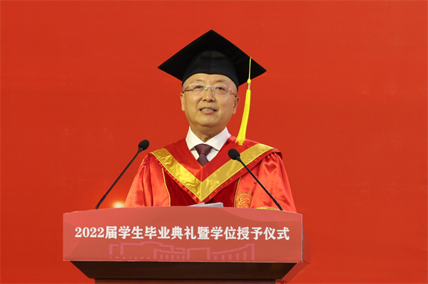 校党委副书记、校长王永生以《涵养家国情怀 坚守道义良知 强化学识根基》为题,作毕业致辞。王永生代表学校向2022届3671名毕业生表示最热烈的祝贺!向为毕业生的成长进步付出辛勤汗水的家长和老师们致以崇高的敬意!