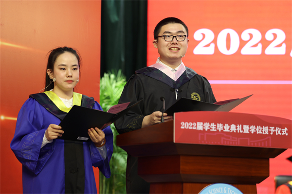本科生毕业生代表经管学院胡珺山同学、研究生毕业生代表光电学院高丽昆同学以诗朗诵的形式,回首大学时光,感谢师长,祝福母校。他们表示,定会不忘师长嘱托,不忘强国重任,不忘时代需求,以实际行动践行“请党放心、强国有我”的铮铮誓言。并预祝母校办学85周年生日快乐。