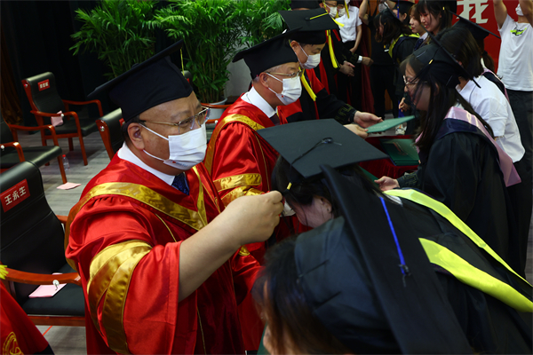毕业典礼后,举行了学位授予仪式。全体校领导为现场毕业生代表拨穗,授予学位。