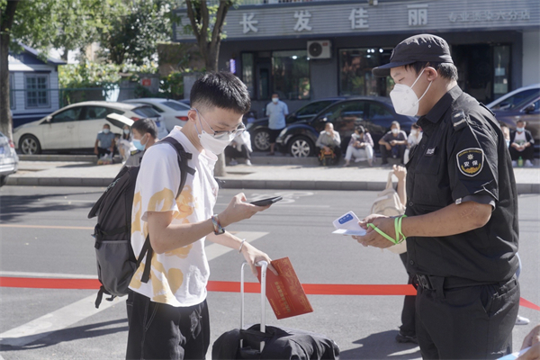 各校区门前学校保卫人员贴好一米线,引导新生有序排队,现场秩序井然,同学们完成查验健康码和行程码、测量体温后有序进入校园。安稳处的老师现场向新生发放反诈宣传页,揭露电信诈骗各种手段和形式,提醒新生谨防上当受骗。