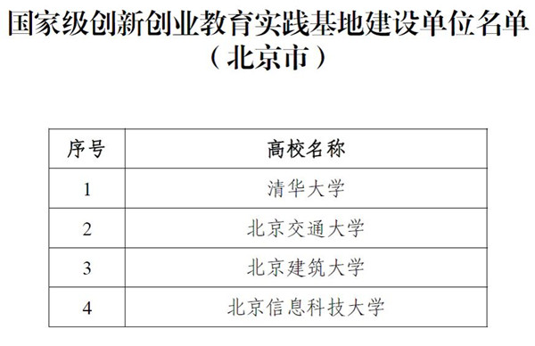此次评选是教育部为贯彻落实新时代国家对创新创业新要求的重要举措,在省级教育行政部门规划、高校自主申报、省级教育行政部门公示推荐、教育部审核的基础上,共认定各100所高校为国家级创新创业学院(以下简称“双创学院”)和国家级创新创业教育实践基地(以下简称“实践基地”)建设单位。此次北京市共有北京大学等6所高校入选“双创学院”,共有清华大学等4所高校入选“实践基地”。