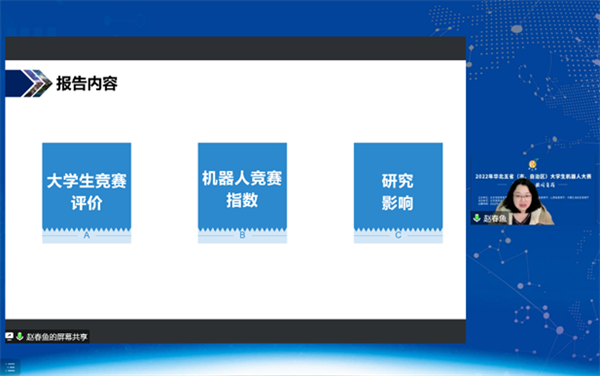 开幕式结束后,全国高校竞赛评估与管理体系研究专家组成员赵春鱼作“全国高校竞赛评估及机器人竞赛研究”主题报告,从“大学生竞赛评价”“机器人竞赛指数”“研究影响”三方面作分享交流,为大赛的高质量发展指明方向。