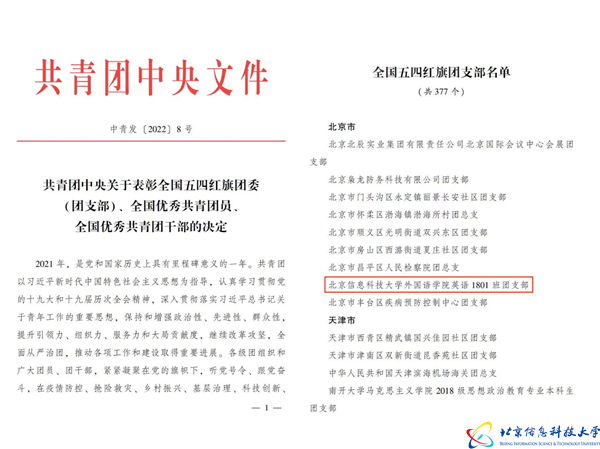 在中国共青团建团100周年之际,学校外国语学院英语1801团支部被授予“全国五四红旗团支部”称号,这也是北京市唯一获此荣誉的高校团支部。校团委荣获建团100周年“北京市五四红旗团委”称号。经管学院团委书记费衍慧获评建团100周年“北京市优秀共青团干部”称号,外语学院王艺霏同学获评建团100周年“北京市优秀共青团员”称号。此外,学校19个团学组织通过了北京市“先锋杯”优秀基层团学组织创建验收。4支团队获评2022年首都大中专学生社会实践优秀团队。在“青创北京”2022“挑战杯”首都大学生创业计划赛中,学校揽获2项金奖、5项银奖、21项铜奖,成绩创历史新高并成功晋级国赛。学校团员青年“志愿北京”注册率高达98.7%,累计参与服务13233人次,志愿时长52906小时,出色完成了冬奥会、服贸会等各项服务保障工作。
