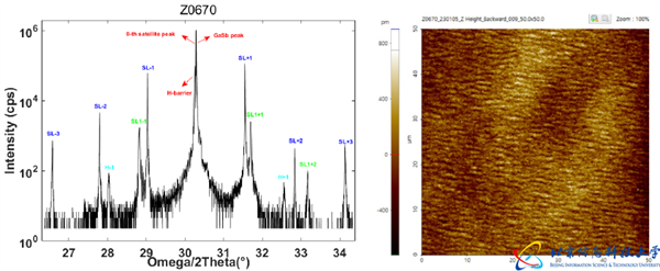 祝连庆教授团队完成InAs/GaSb/AlSb/GaSb短波红外超晶格探测器材料外延,为了降低暗电流以及工作偏压,设计载流子提取器短波pBin结构,变温的超晶格6InAs/6GaSb/5AlSb/1GaSb吸收区的光致发光谱如图1所示,显示其截止波长2.8μm,符合设计值。XRD测试显示吸收区卫星峰半宽为33s, AFM扫描50×50μm大区域下RMS为0.17nm,表面粗糙度小。以上结果表明,实验室已经突破短波红外探测器材料外延技术,为器件加工奠定基础。