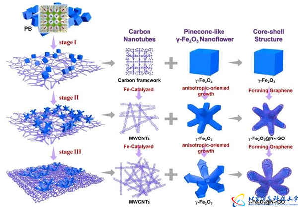 此外,该团队在二维吸波材料领域也取得了创新性的科研成果。采用了基于柯肯德尔扩散效应的原位各向异性取向生长策略,制备出具有多级结构的碳基磁性复合材料γ-Fe2O3@N-rGO@MWCNTs。该多级结构具体为核-壳结构的松果状纳米花结构。上述结构可提供丰富的吸波效应,包括传导损耗,界面极化,偶极极化,涡流损耗和自然共振,特别是松果状核-壳结构纳米花的电磁协同效应,表现出优异的电磁波吸收性能。相关成果于2022年11月发表在Journal of Alloys and Compounds期刊上(影响因子6.371,TOP期刊),廖擎玮副研究员、秦雷研究员为共同通讯作者。