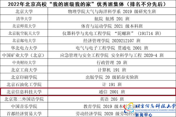 长期以来,学校高度重视学生班集体建设,把班集体建设作为学生思想政治教育工作的重要抓手,持续滚动式开展“勤信”班集体创建、培育、考评工作,将理想信念教育、爱党爱国教育、优良学风培育等融入班集体建设中,推动学生基层组织建设制度化、规范化、科学化,以评促建,以点带面,强化优秀典型选树和育人功能发挥,切实提高班风学风建设水平,形成朝气蓬勃、锐意进取的校园氛围。接下来,学校将以高质量党建引领党团班一体化建设,引导班级在加强学生日常思想政治教育、提升学生综合素养、服务北京“四个中心”建设等方面发挥积极作用,展示新时代青年奋发向上的精神风貌,促进学生成长为更好的自己。(供稿:党委学工部 绳娈 图片:信通学院 史文硕 编辑:李萌 审核:杨静)