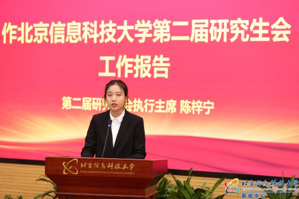 校研究生会执行主席陈梓宁代表北京信息科技大学第二届研究生会作题为《踔厉奋发建功新时代 砥砺前行争做好青年 引领广大研究生在建设信息特色鲜明的高水平应用型大学中贡献青春力量》的工作报告。