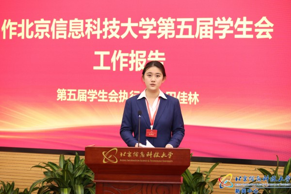 校学生会执行主席田佳林代表北京信息科技大学第五届学生会作题为《筑基强根 聚力提能 笃行致远 惟实励新 团结带领信息科大学子在奋进新时代中勇担当、善作为》的工作报告。