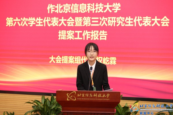 大会提案组代表权屹霖作《北京信息科技大学第六次学生代表大会暨第三次研究生代表大会提案工作报告》