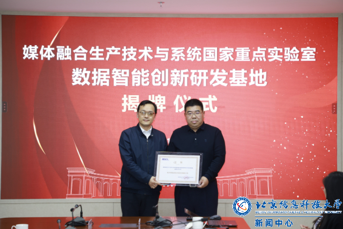 12月10日下午,由新华社媒体融合生产技术与系统国家重点实验室、北京信息科技大学、拓尔思信息技术股份有限公司三方联合建设的媒体融合生产技术与系统国家重点实验室数据智能创新研发基地揭牌仪式在沙河校区立德楼举行。