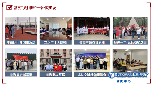提升核心能力,全面成长成才;强能力,努力创建实干型集体。班级共有党员20名,入党申请书提交率为100%。班级同学100%成为注册志愿者,2023年前往十八洞村开展社会实践,班级志愿时长累计2500小时。深度参与校院两级重点工作,工作案例被北京青年报报道。班级所在党支部获评红色“1+1”北京市三等奖,所在团支部获评学校2023年度优秀团支部第一名,连续两年获评校勤信班集体第一名。