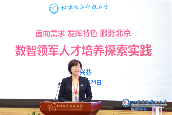 王兴芬以《面向需求 发挥特色 服务北京 数智领军人才培养探索实践》为题,围绕学校整体情况、未来数智产业学院的建设、数智领军人才培养模式改革、人才培养成效四个方面作介绍报告。