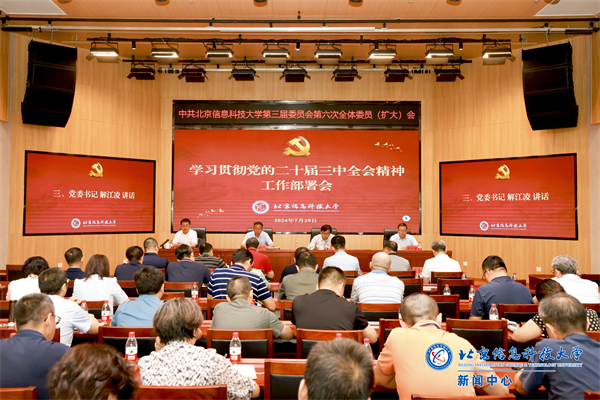 7月29日,北京信息科技大学在沙河校区立德楼603报告厅召开党委(扩大)会,研究部署学习宣传贯彻党的二十届三中全会精神。校党委书记解江凌出席会议并讲话。校党委副书记、校长郭福主持会议。