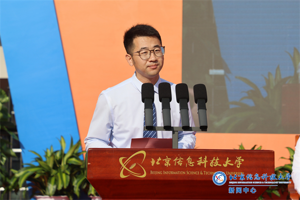 教师代表、自动化学院李连鹏老师向各位新同学诚挚分享如何在信息科大开启一场关于自我发现与超越的旅程。他说,应对挑战、体验成败、战胜挫折都将是大家在大学阶段要完成的“必修课”。他借用解江凌书记对年轻教师的嘱托与同学们共勉:把事当事干,学习要一丝不苟、精益求精;工作要踏踏实实、勤勉尽责;把小事当大事干,注重细节、坚持勤实信行的作风;把明天的事当成今天的事来做,不断提升自己的综合能力和竞争力;把集体的事儿当成自己的事儿来办,树立主人翁的责任感和使命感;锤炼综合能力,拓展人生格局,勇担民族复兴伟业重任!