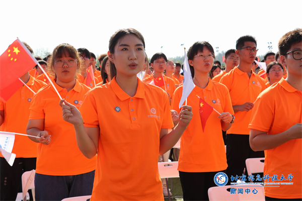 典礼现场,全场起立,迎校旗。全体新生郑重宣誓:将秉承“勤以为学,信以立身”的校训精神,胸怀信息强国之志,躬身青春报国之行,为实现中华民族伟大复兴的中国梦贡献信息科大力量!请党放心,强国有我!