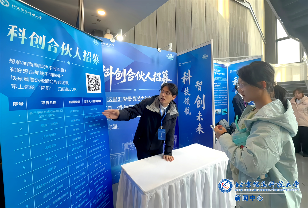在“科创合伙人”招募现场,“挑战杯”“国创赛”等15支金牌团队面向全校公开招募技术、运营、设计等多方向合伙人,现场学生在展位前驻足咨询、扫码加入,初步形成了十余个跨层次、跨学科的组队意向,为学生开展有组织科研提供了渠道。