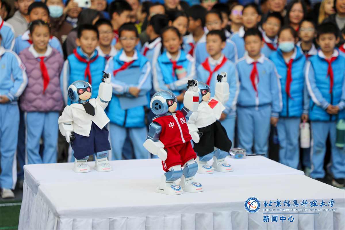钟琴车乐声悠扬,清脆启幕;舞蹈机器人随音乐律动,精准同步;足球机器人左攻右防,激战正酣。机电学院、光电学院、管理学院等带来的“科创T台秀”,瞬间点燃全场热情。校党委副书记、校长郭福,校党委常委、副校长贺威来到现场,与来自上地实验小学和永泰小学的师生代表共同见证了这一精彩时刻。