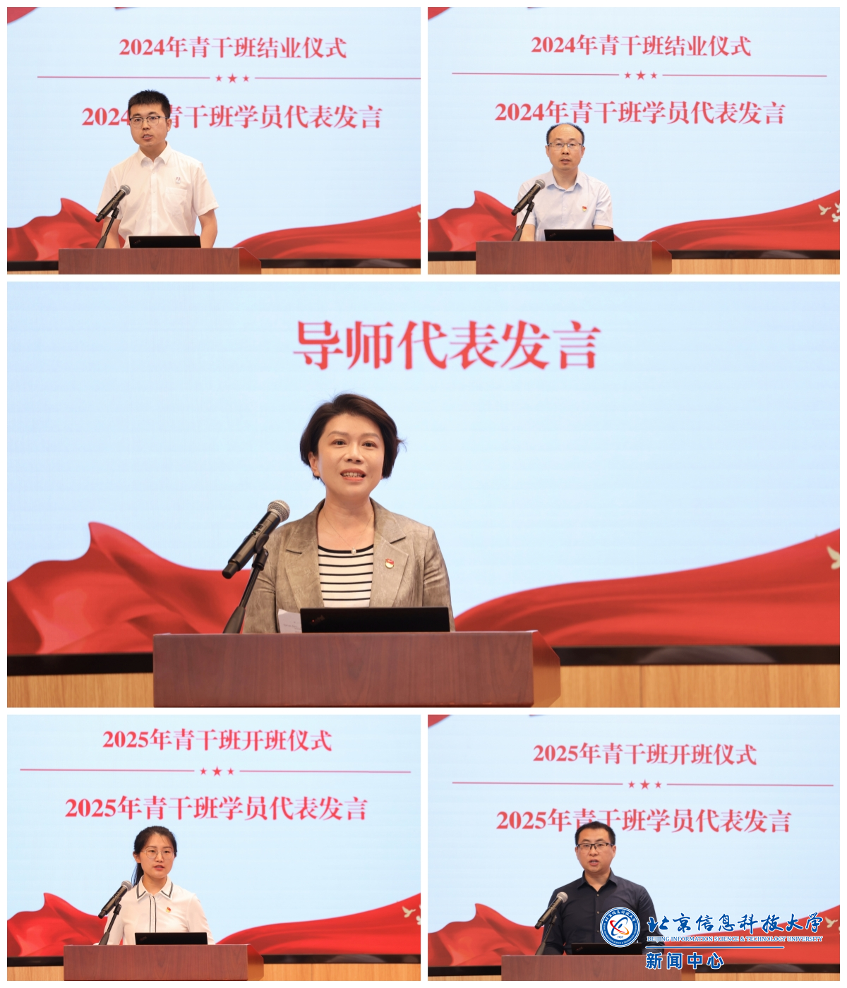 信通学院党委副书记、院长李学华作为导师代表进行了发言。2024年青干班学员代表王梦晨、黄文奇分享了心得体会和学习收获。2025年青干班学员代表王玉荣、郭陈栋作表态发言。